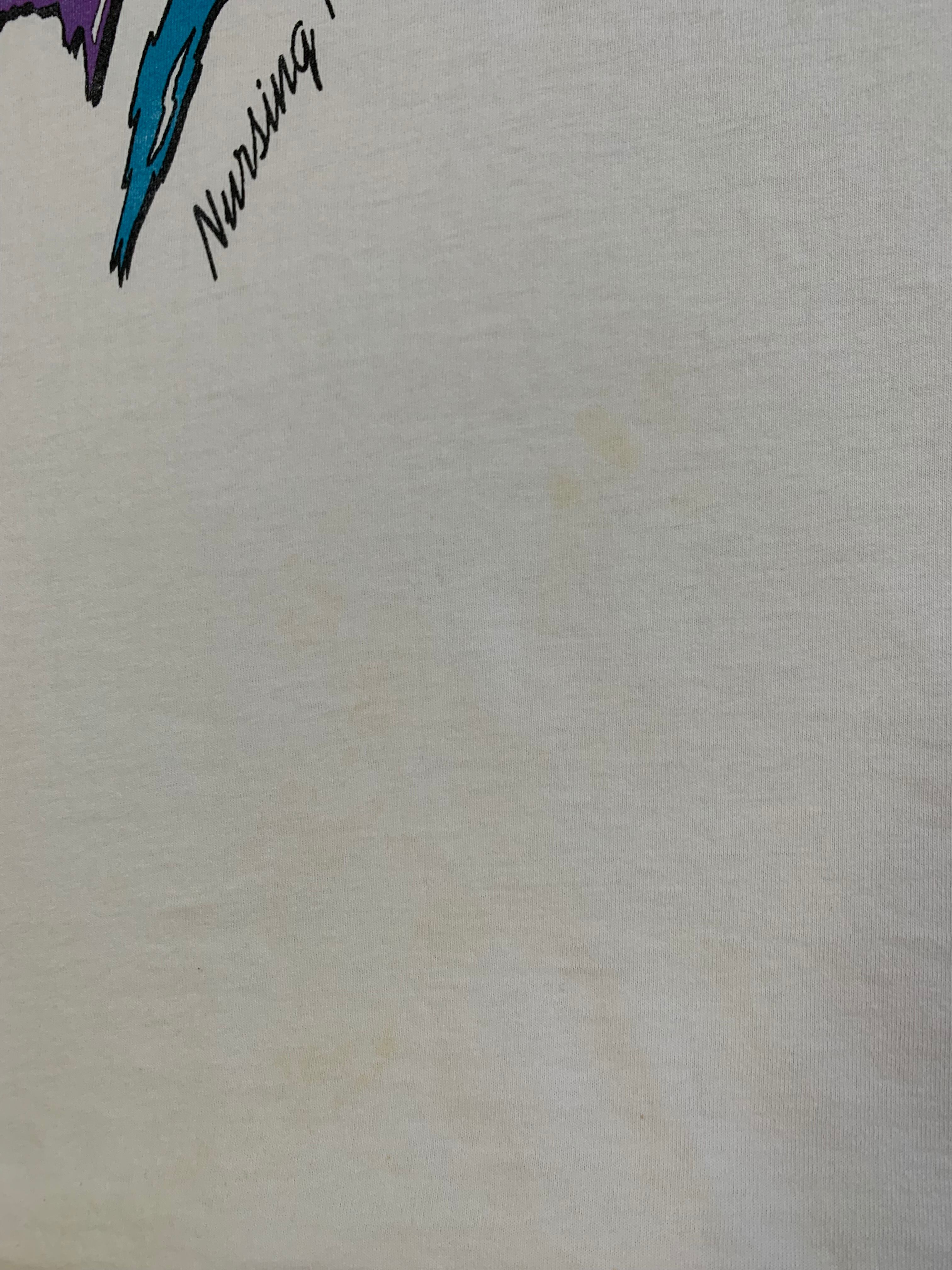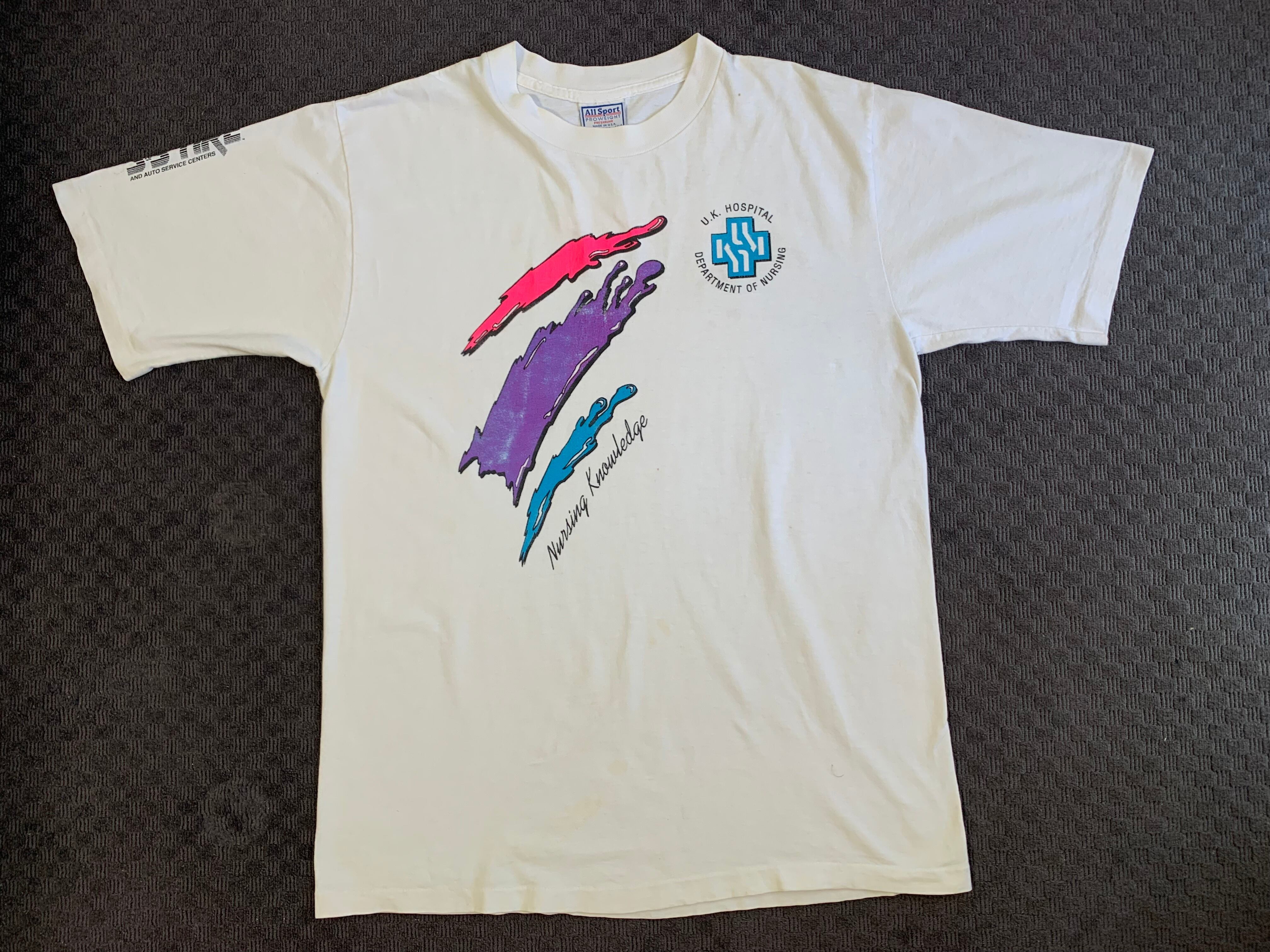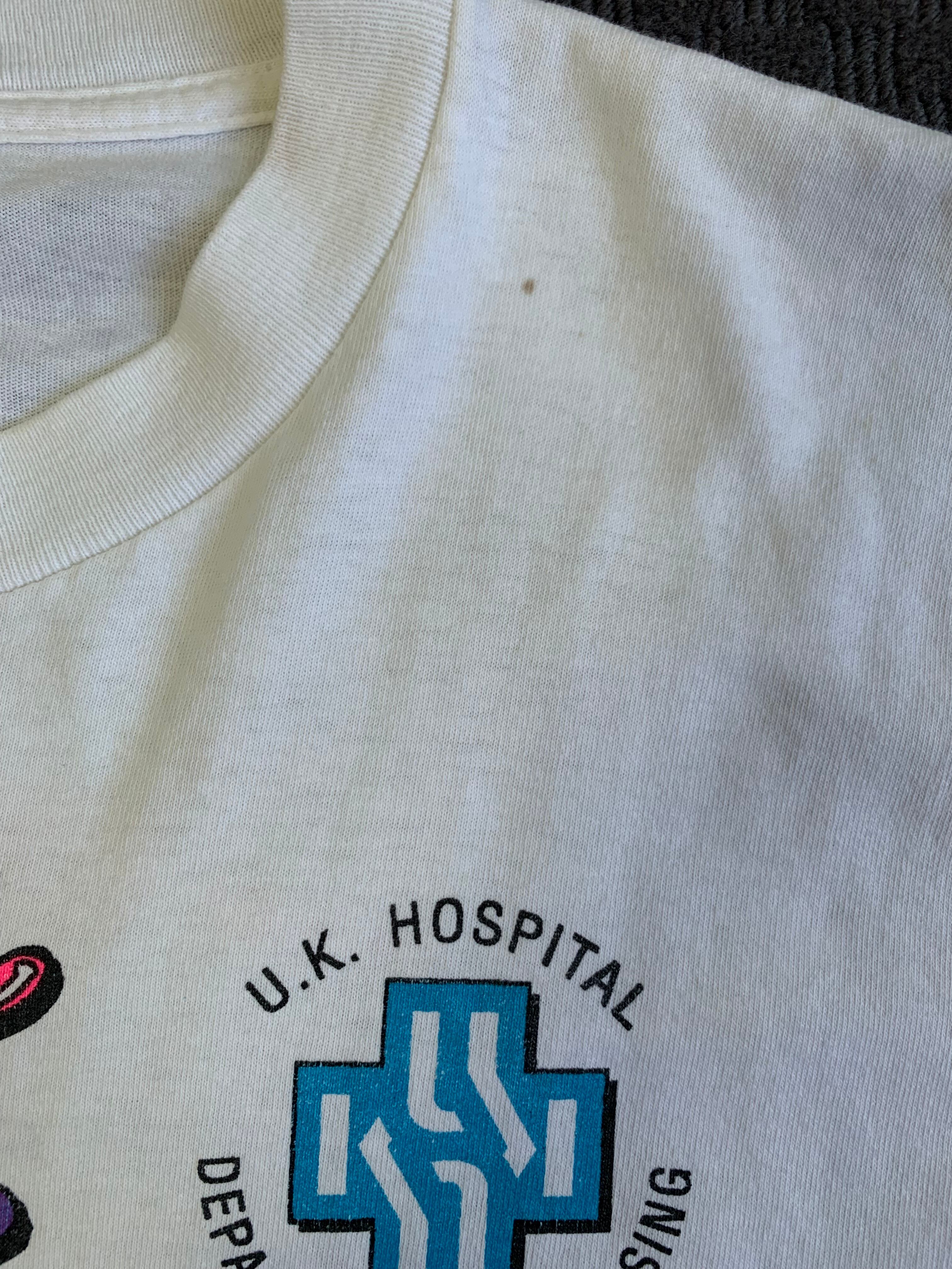 ホスピタル系のTシャツで、表にも裏にも配色の良いデザインが入っていて、アームにも企業ロゴが入っています。