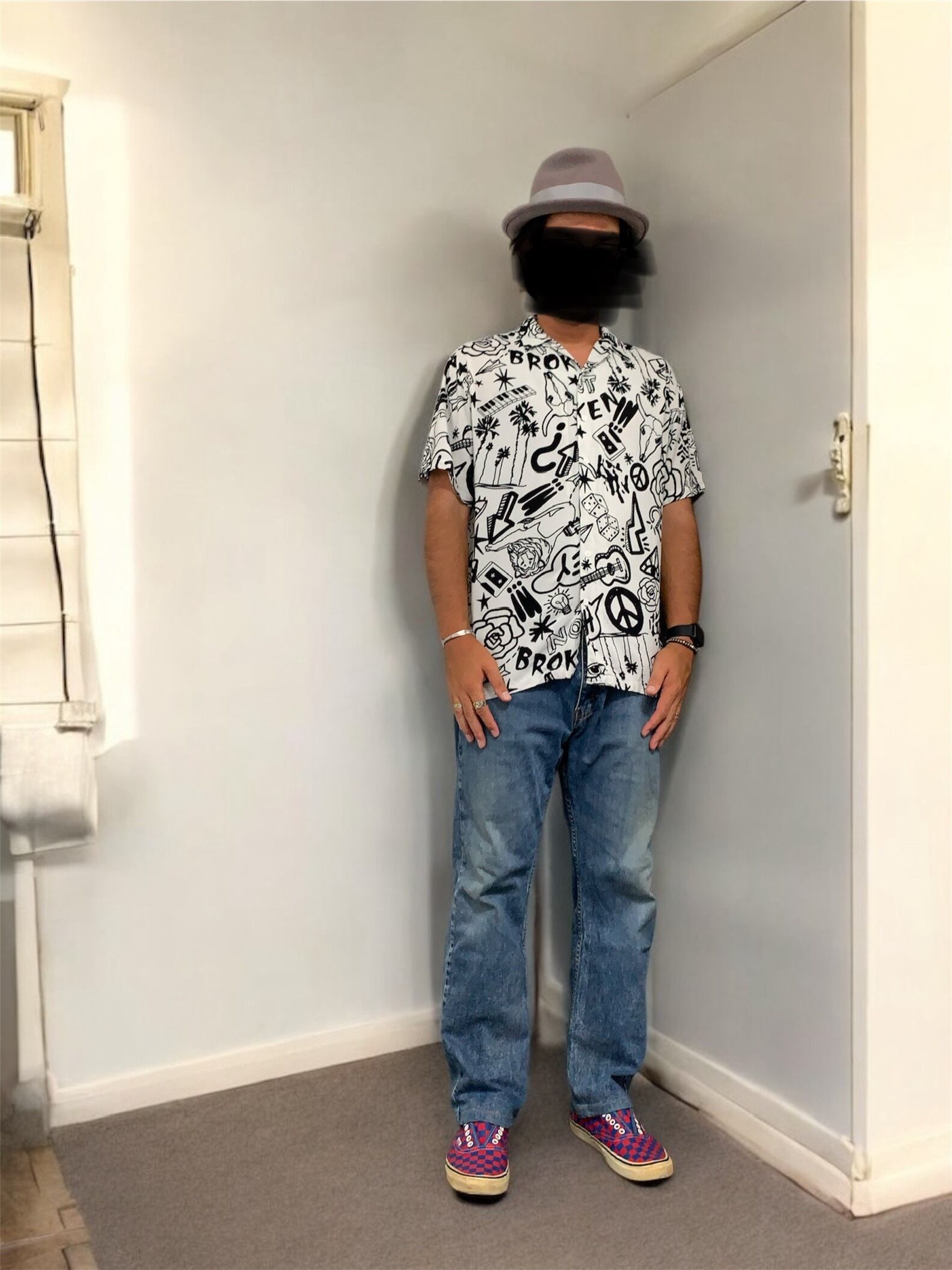 ホワイトとブラックで、動物や植物、楽器などあらゆる柄が入ったデザインが魅力的な、アメリカカジュアルブランドのシャツとなります。