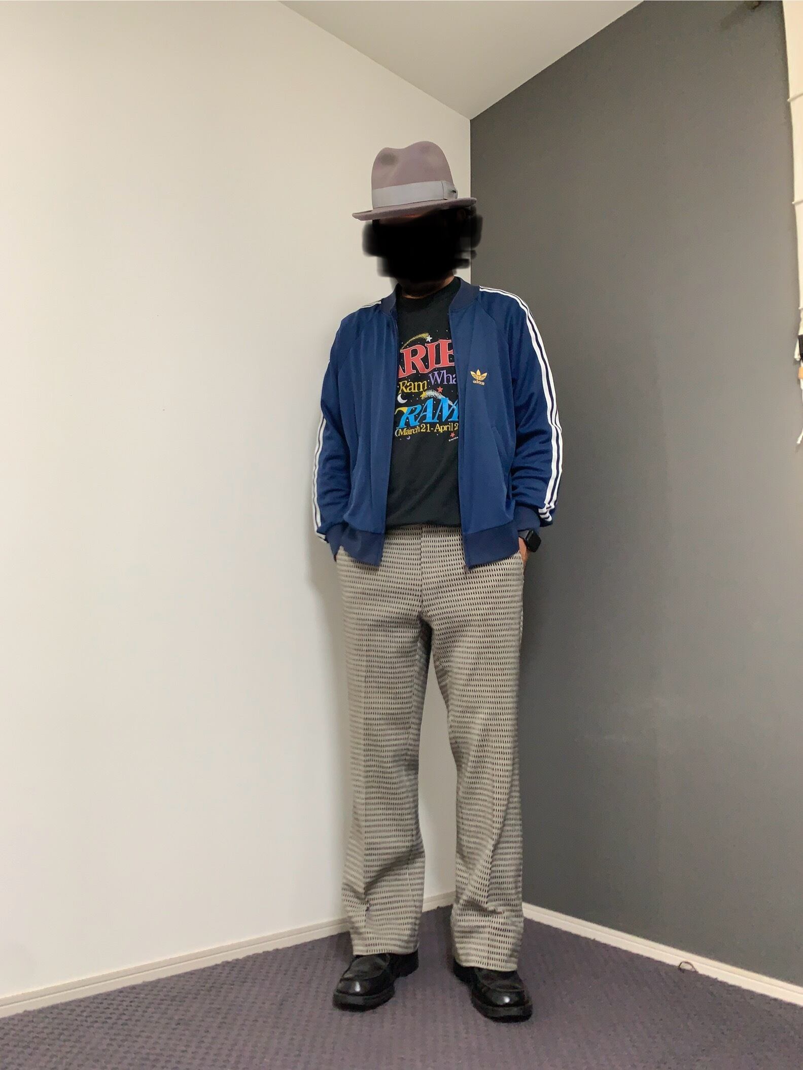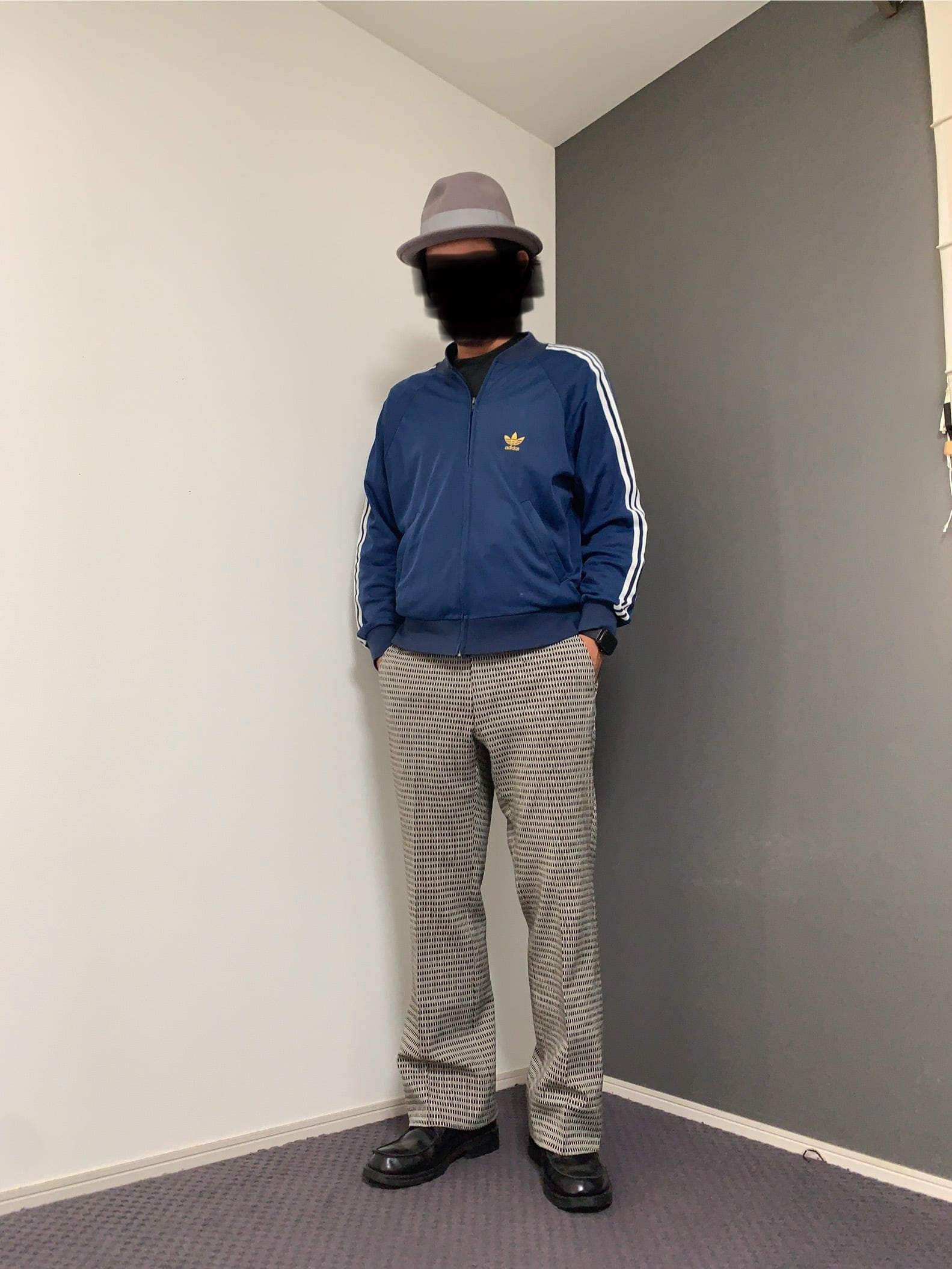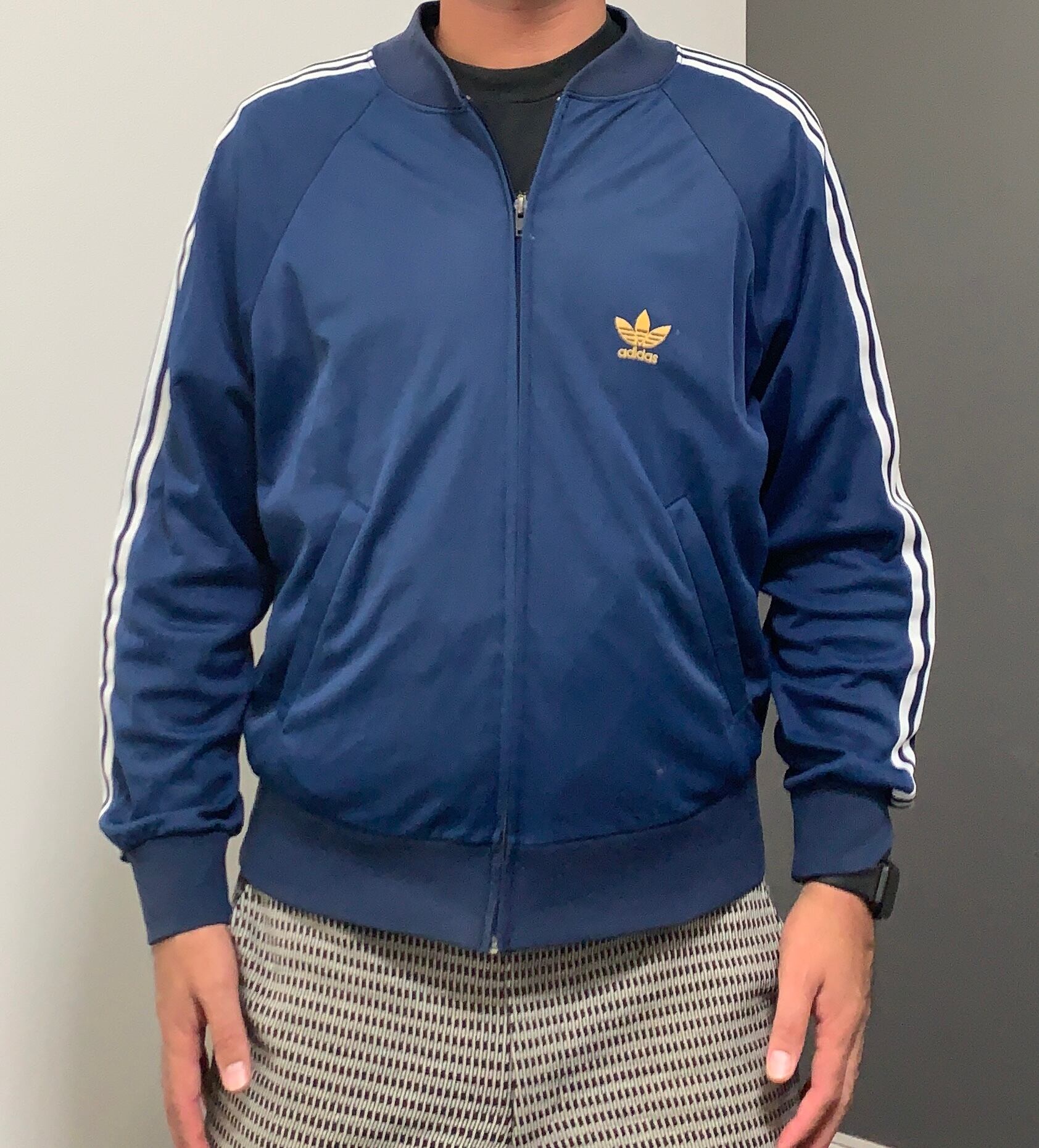 ネイビーカラーのスリーラインで、イエローのトレフォイルのロゴが、シンプルで格好いいです。