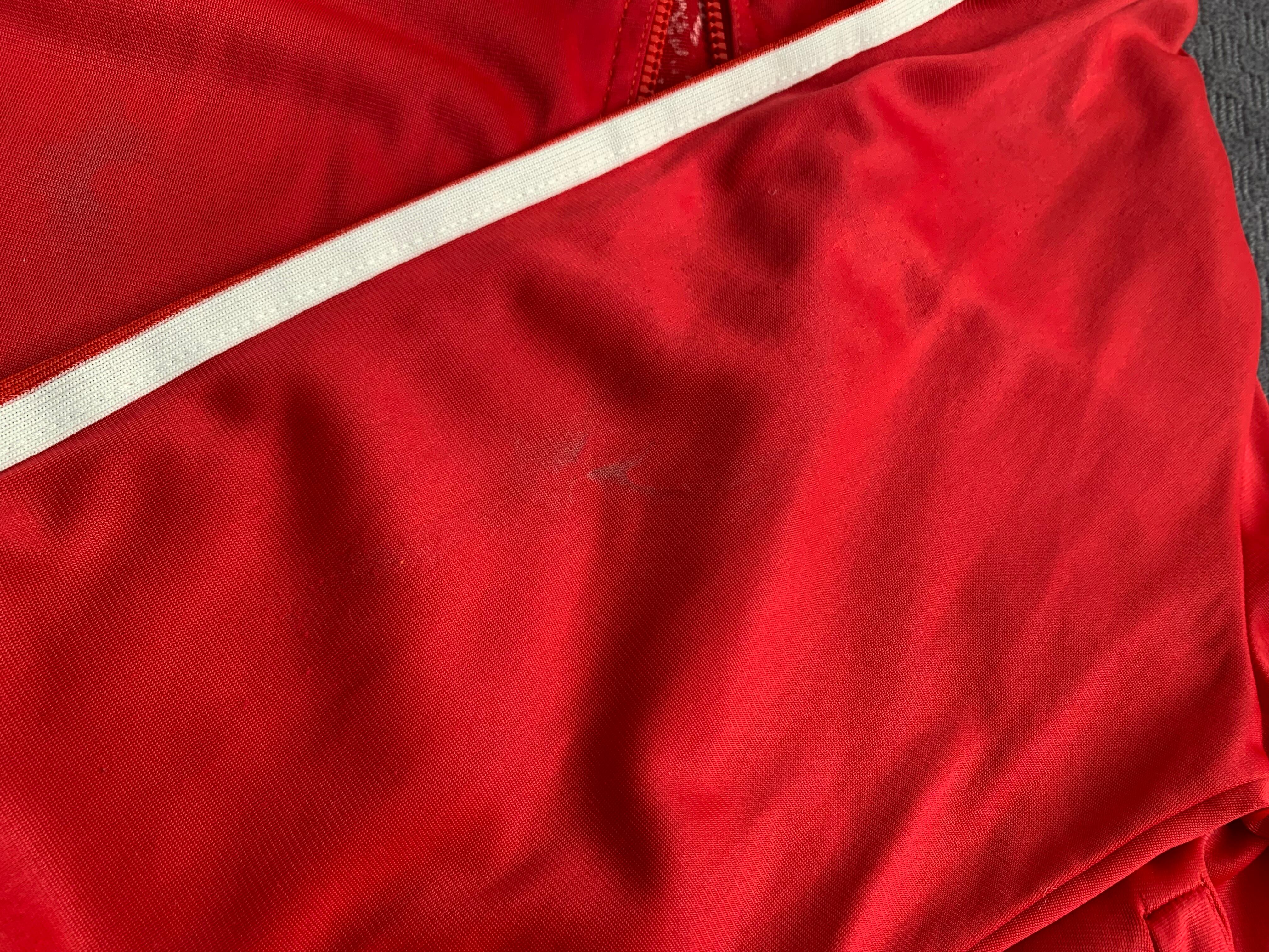 状態は、内側の生地が剥がれてしまっているのと、両腕と右胸あたりにキズのような跡、右腕にピンホールがあります。