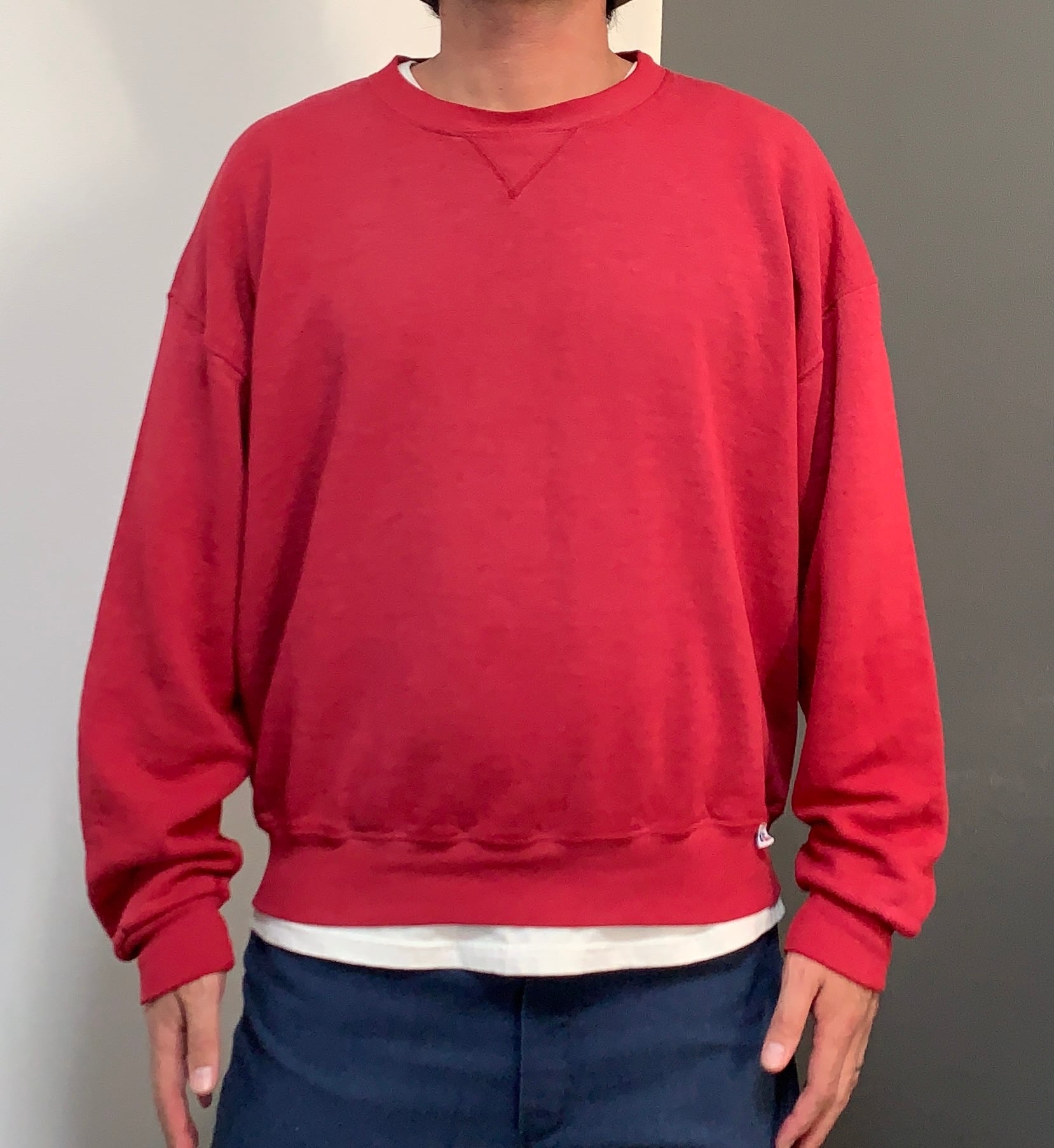 褪色して白が混じった霜降りのようなレッドの無地に、XLsizeで着丈短めで身幅しっかりのボックスシルエットは、シンプルで、1番合わせやすいスウェットとなっています。