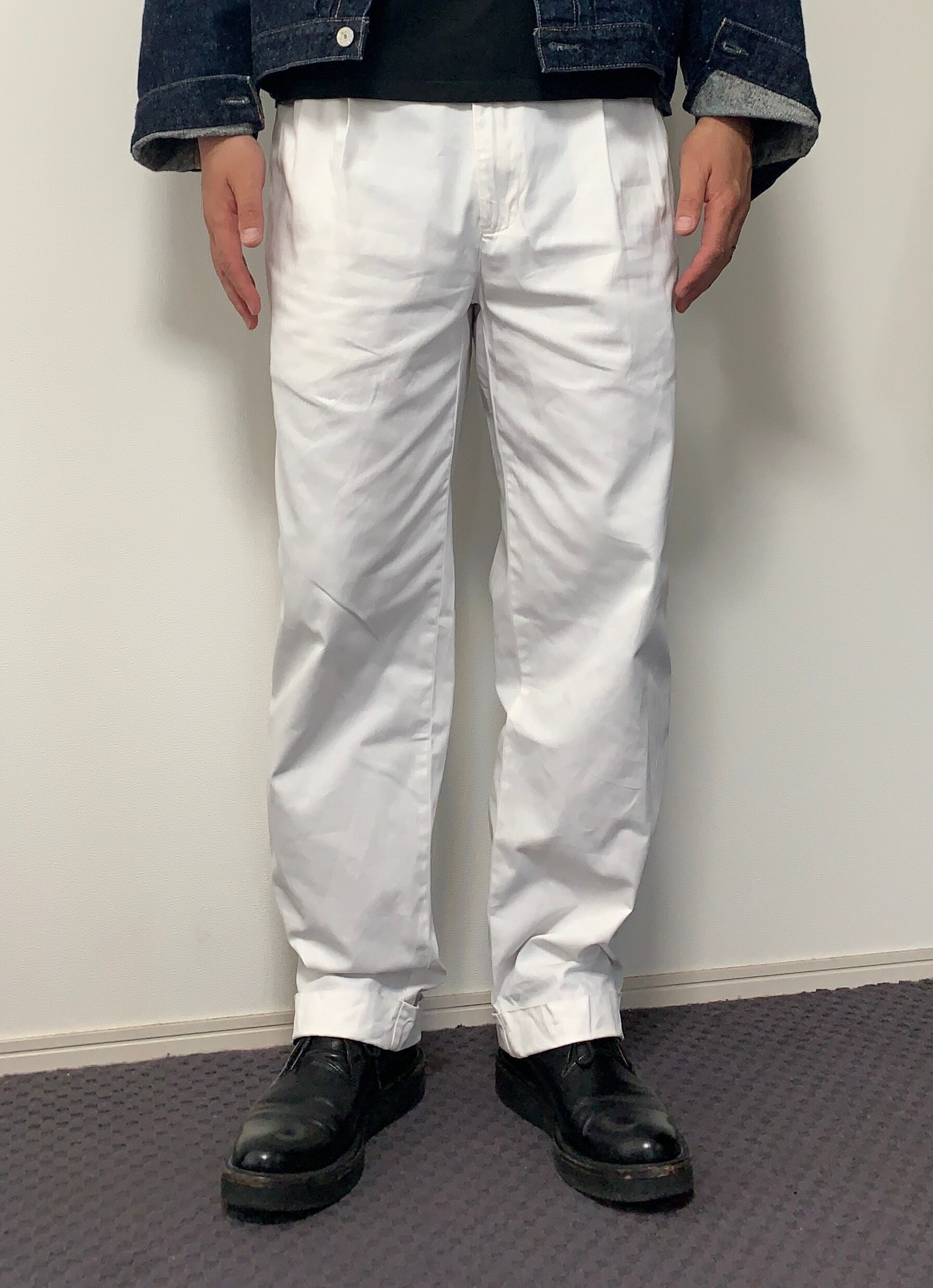 ポロチノ特有のワイドシルエットに、ホワイトカラーという一見綺麗めなパンツかと思いきや、白のペインターパンツのように、ガシガシに汚して、いなたい感じで、わざとペンキを飛ばしても良いのではないか、という感じに履きこなしていただきたいです。