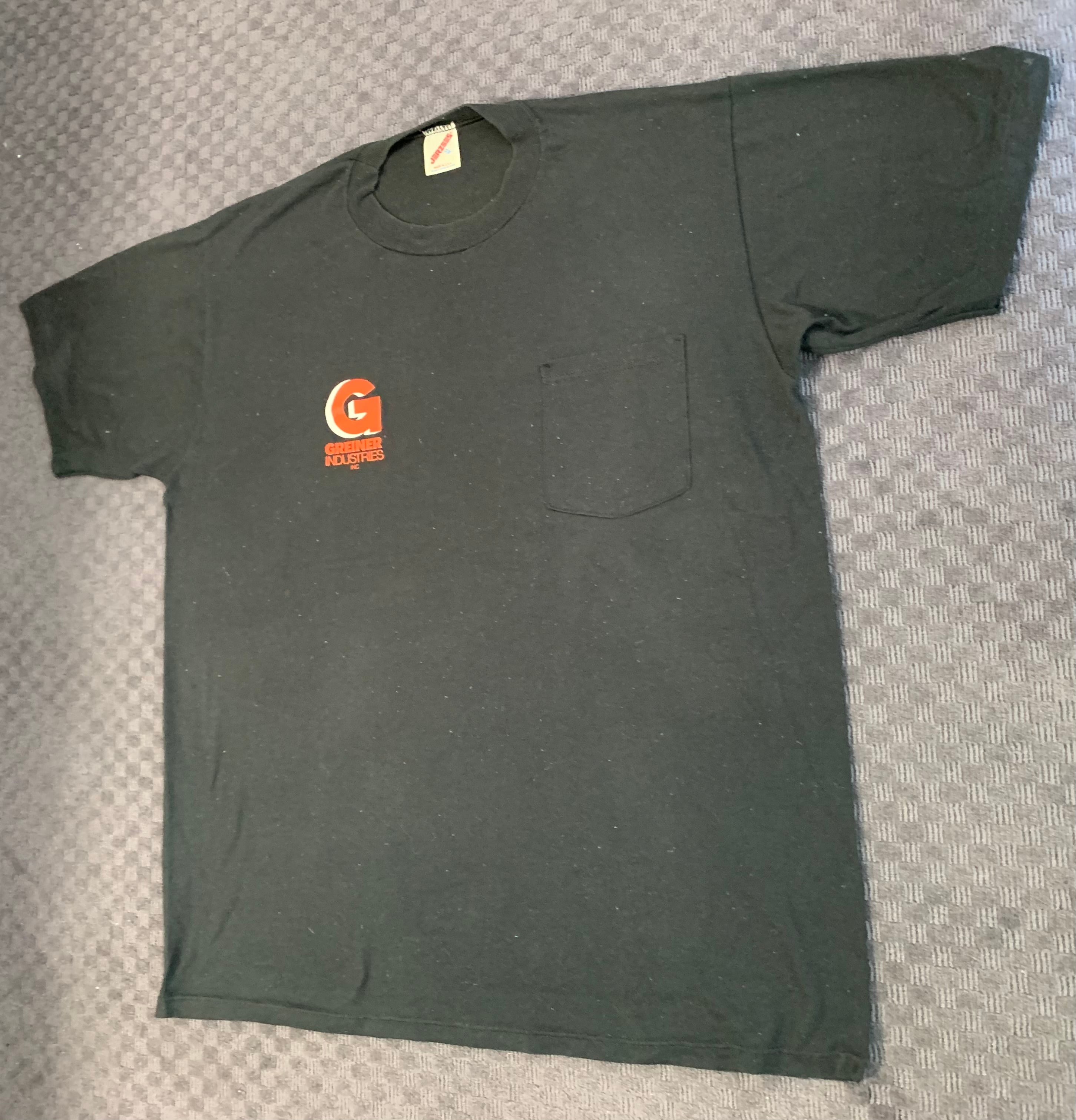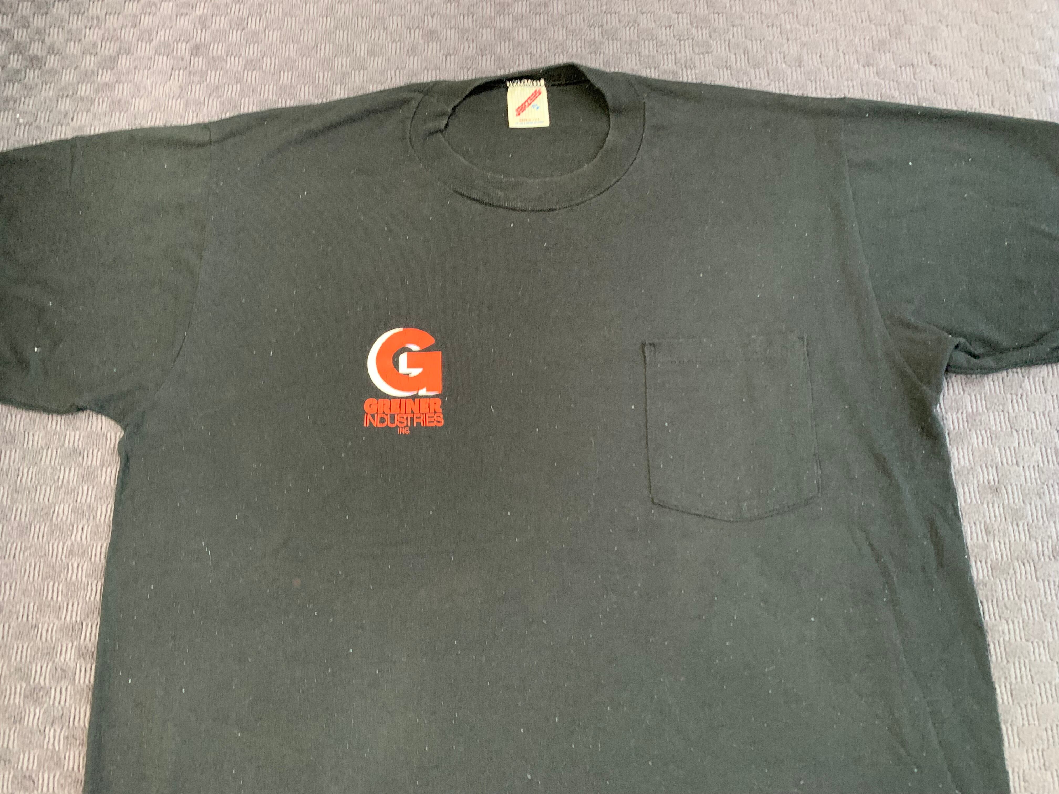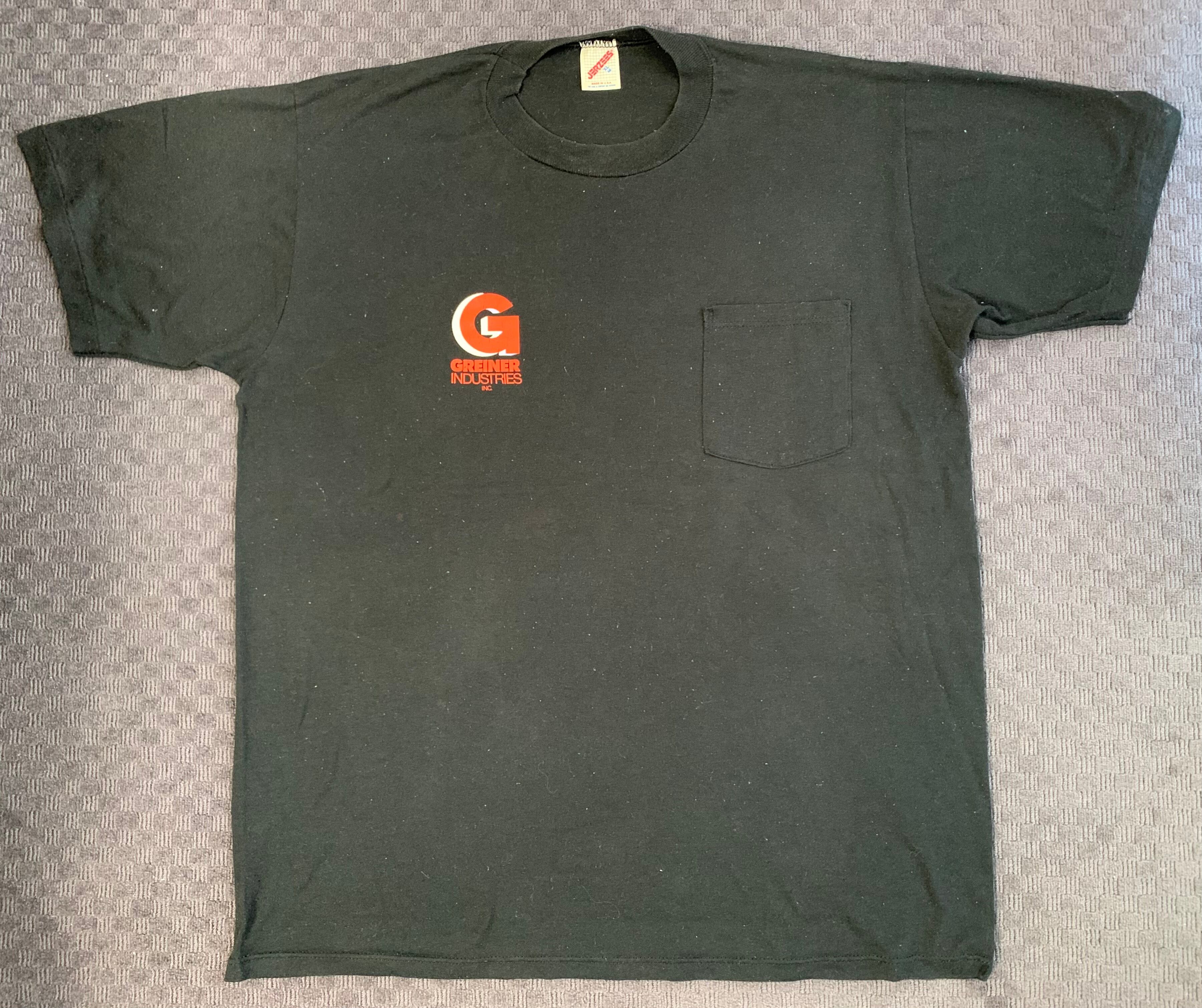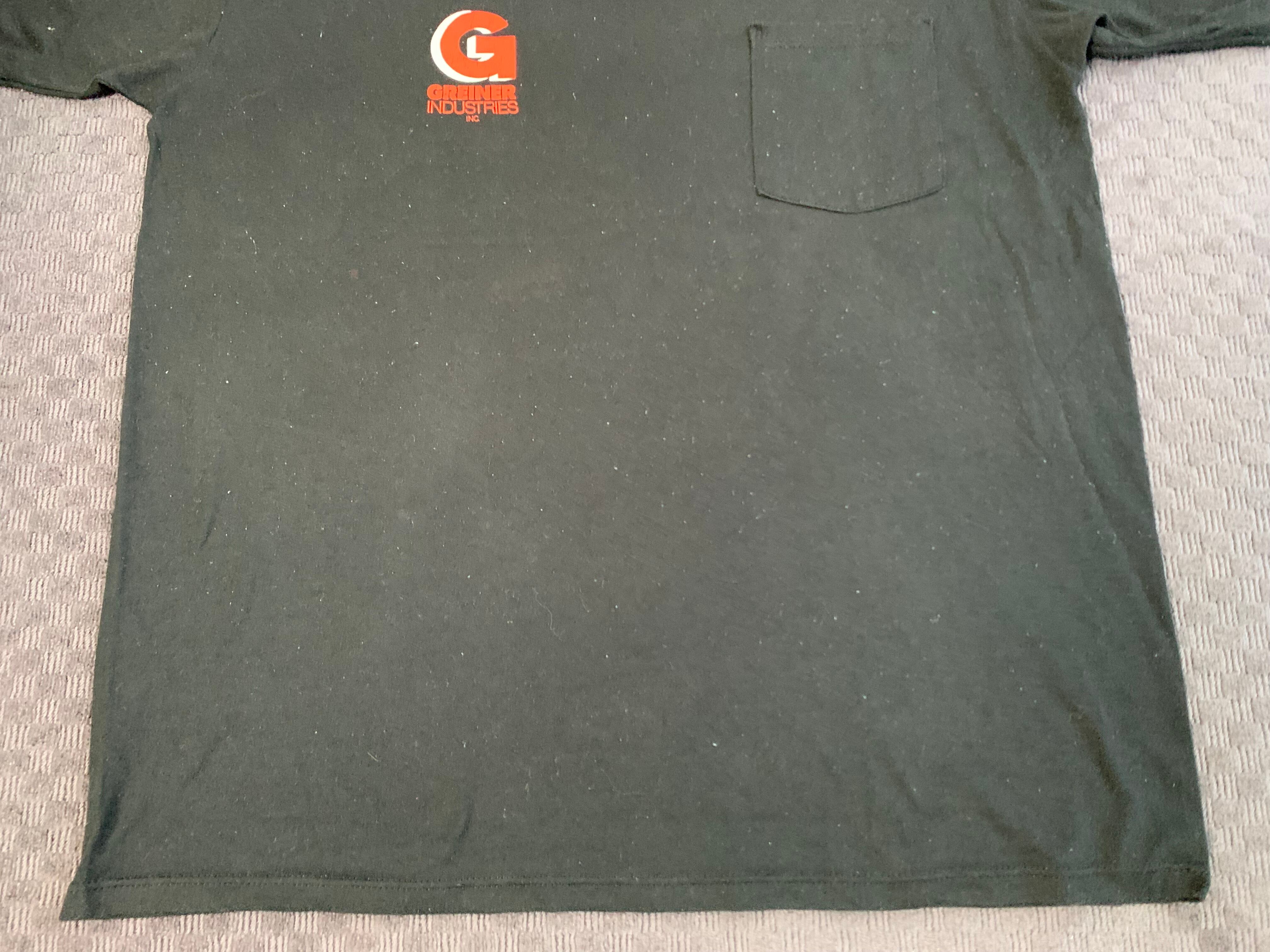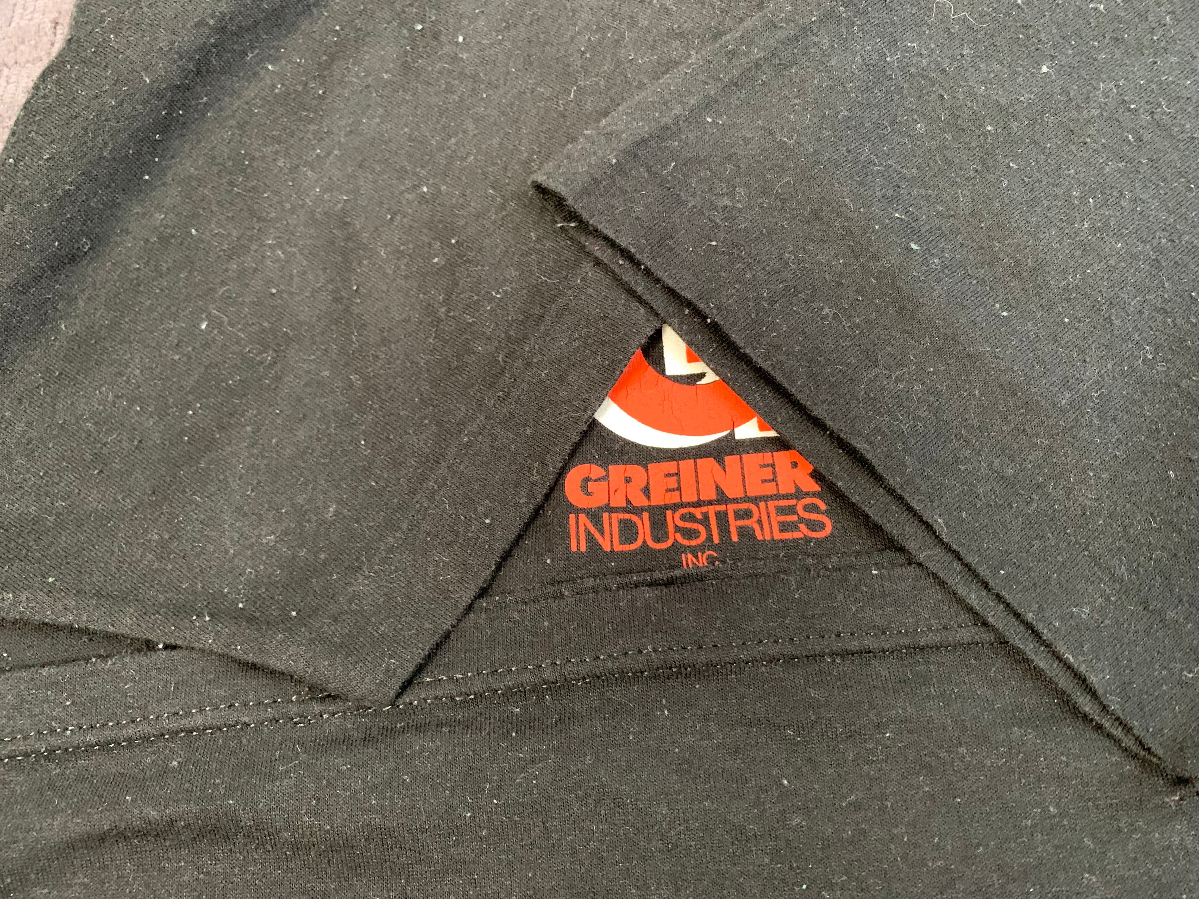 胸ポケットつきの、GREINER INDUSTRIES INC.という企業のロゴがプリントされている、シンプルなデザインのアイテムです。