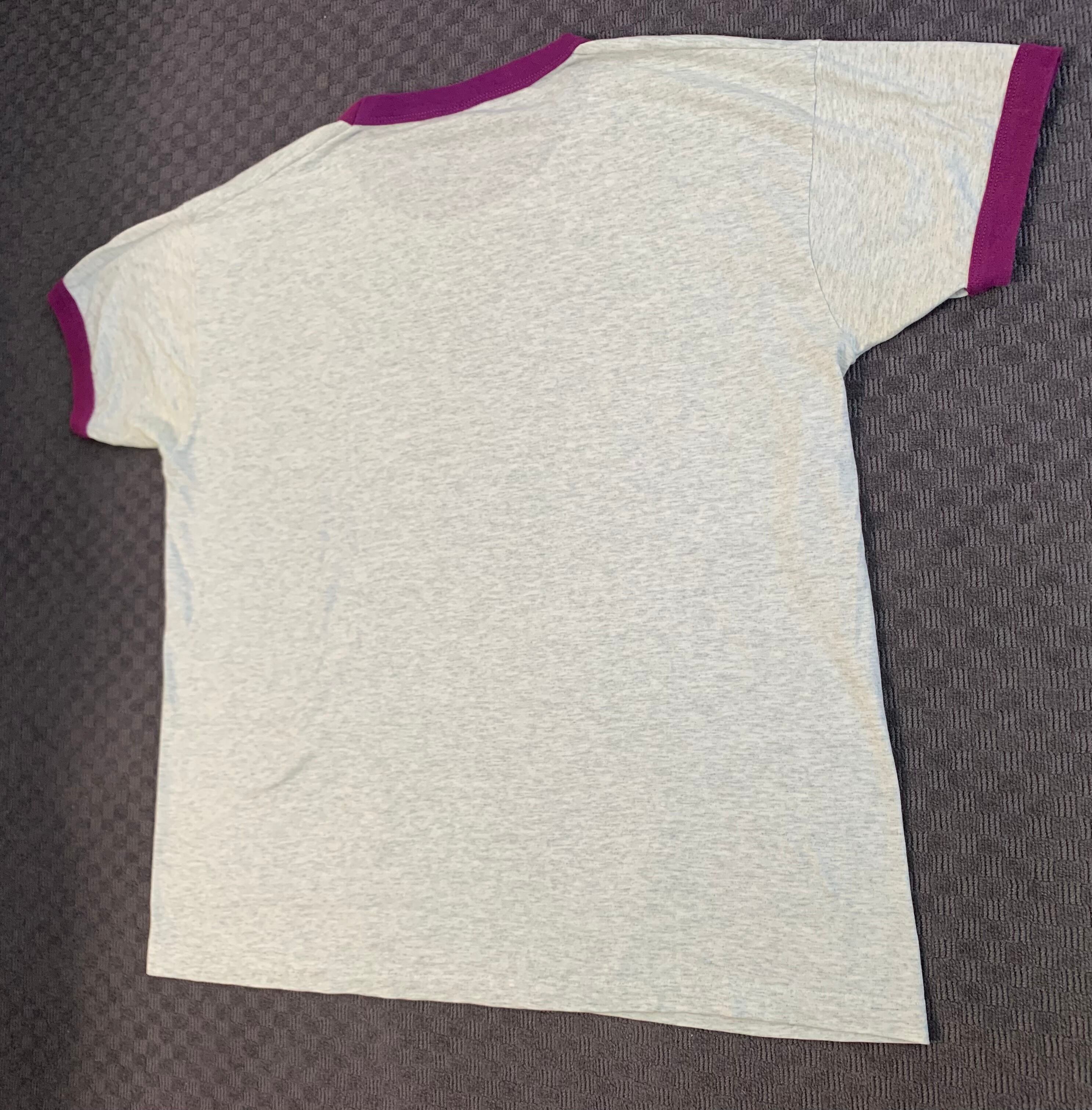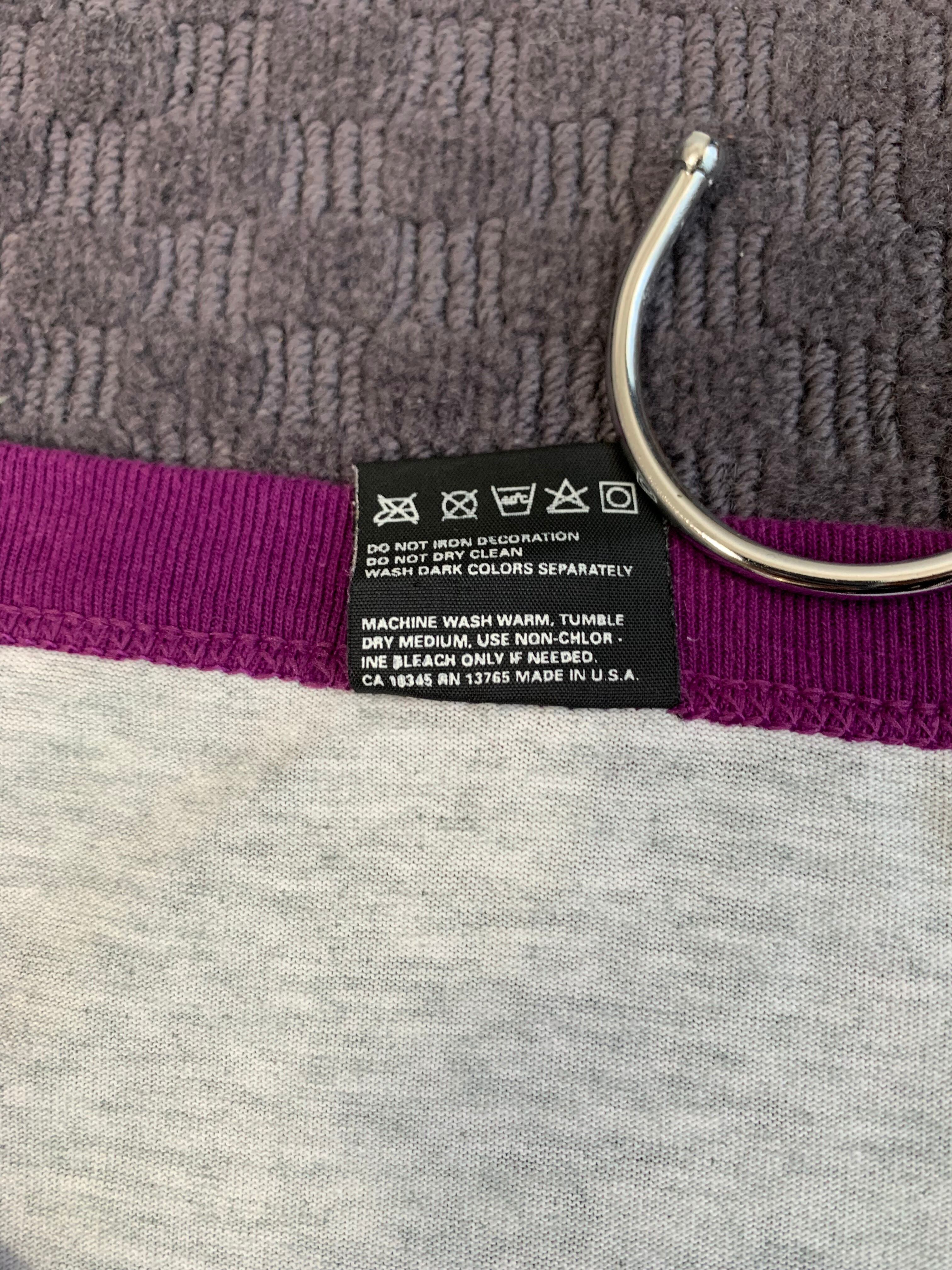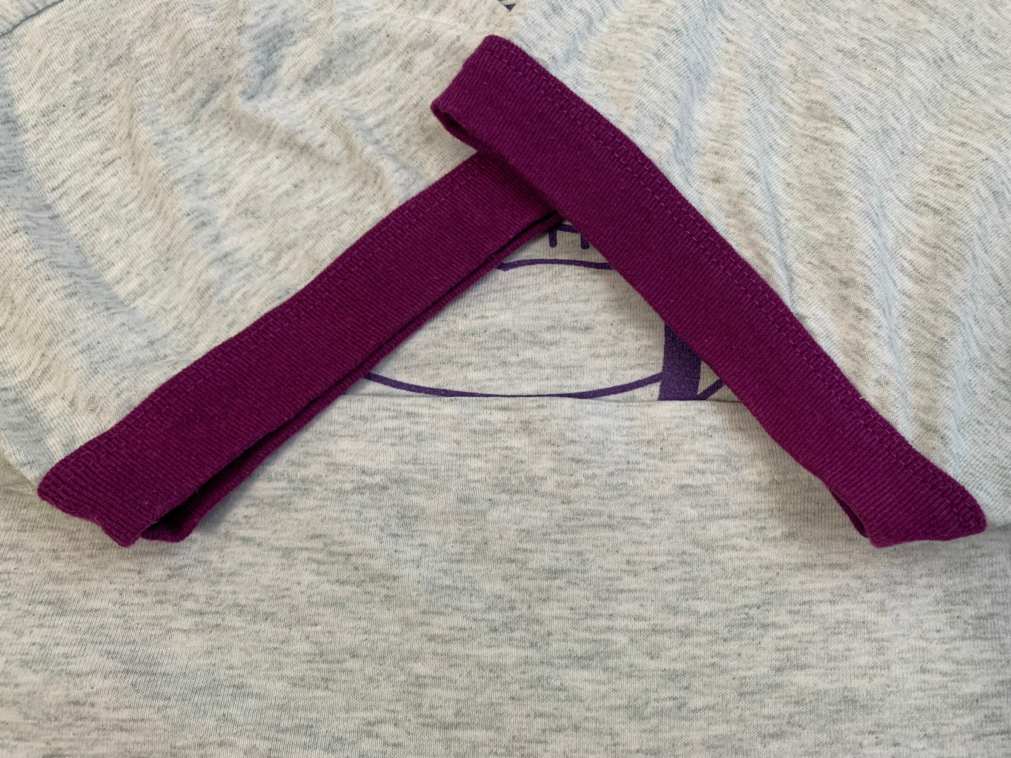 フルーツの黒タグBESTラインで、裾シングルステッチの霜降りグレーボディに、襟と腕のパープルのラインが可愛いリンガーTです。